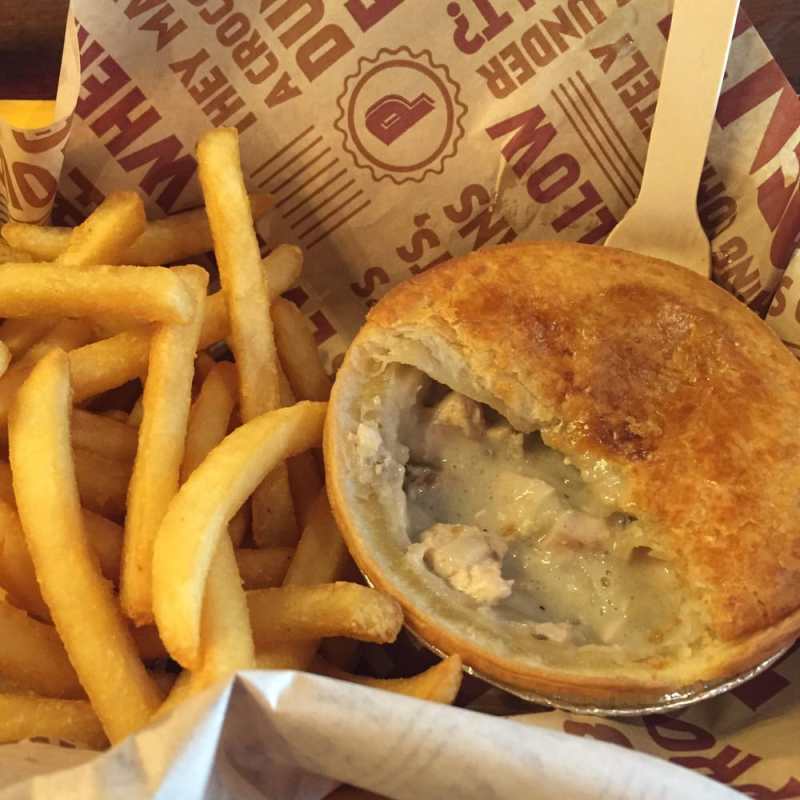 As someone with West Indian roots I was drawn to the Mumbai Pie while looking at the menu being it contains curry lamb. I ordered this with a side of beer-battered fries, macaroni and cheese and a glass of sweet tea. As the waitress brought the plate to me the aroma hit me immediately, sparking an excitement to taste the food. As I bit into the crispy, light brown pie I tasted the savory crust. The crust was of a texture similar to that of an apple pie but not as sweet. While biting more into the crust the spicy curry sauce busted into my mouth giving me a taste of the chewy lamb which was seasoned to perfection.